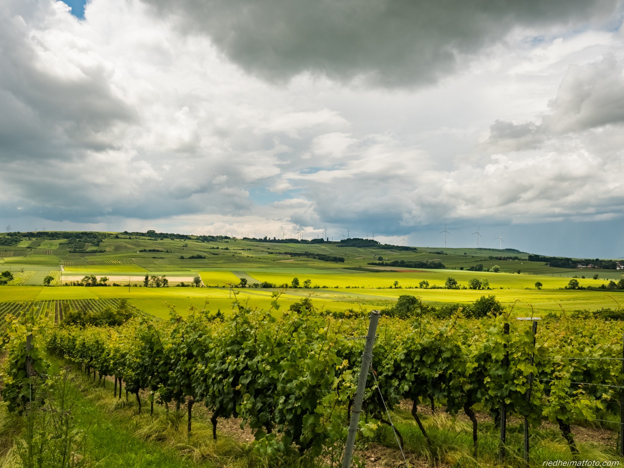 Mittels Belichtungsreihe ist es nun möglich schöne Konturen in den Wolken zu haben und das Lichterspiel auf den Feldern herauszustellen. Auch der Wein im Vordergrund hat eine anständige Belichtung und Struktur.