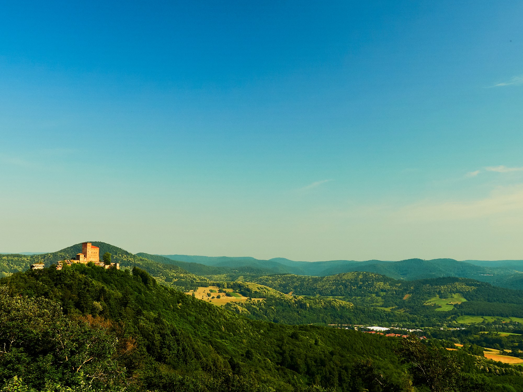 Von der Burg dort nochmals der Blick ins Land mit links dem Trifels und rechts Annweiler und nördlichem Pfälzer Wald: