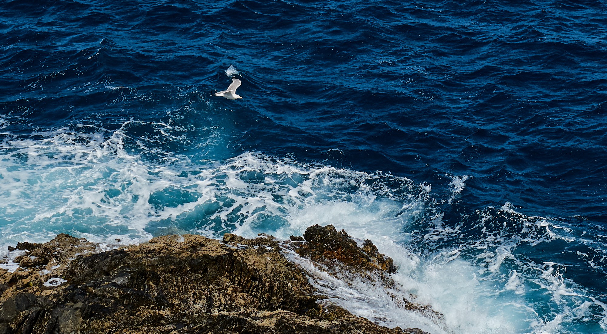 Im Westen wird der Strand dunkel, und Klippen dominieren.